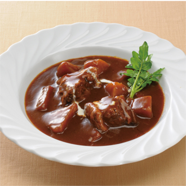 素材 | ハーブ煮込牛肉(牛肉、香辛料)(国内製造)、野菜(じゃがいも、にんじん)、赤ワイン、ビーフブロス、トマトペースト、小麦粉、ローストオニオンペースト、砂糖、ビーフエキス調味料、牛脂、ソテードオニオン、たん白加水分解物、チキンエキス、食塩、バター、香味油、香辛料/調味料(アミノ酸等)、増粘剤(加工デンプン)、カラメル色素、香料、(一部に小麦・卵・乳成分・牛肉・大豆・鶏肉・豚肉を含む) |