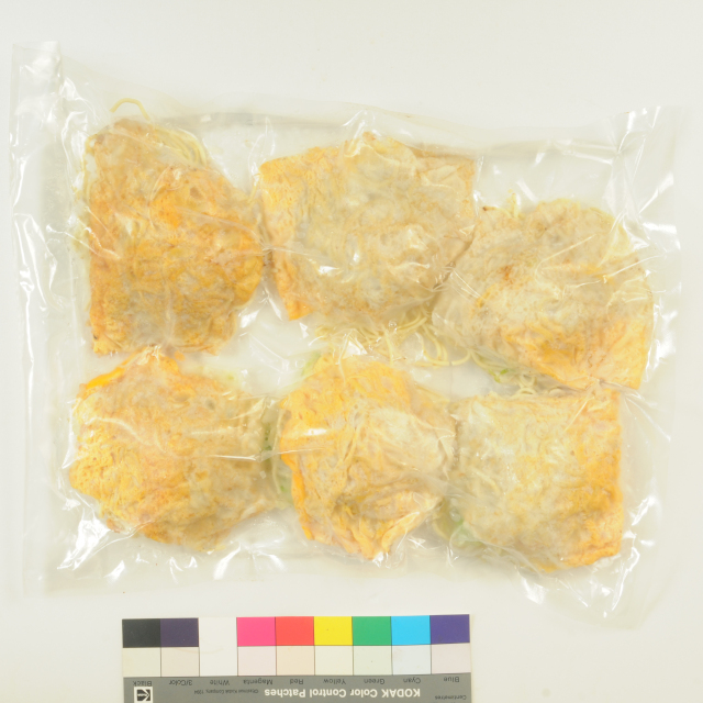 素材 | キャベツ(国産)、中華そば(小麦粉、食塩、小麦蛋白)、卵、小麦粉、豚肉、もやし、天かす、かつお削りぶし、食塩、酒/調味料(アミノ酸等)、かんすい、ソルビット、酒精、増粘多糖類、焼成Ca、クチナシ色素、(一部に小麦・卵・大豆・豚肉を含む) |