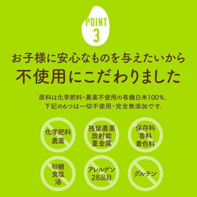 - 国産有機白米100%使用、有機JAS認証取得のベビーフード用おこめパフ