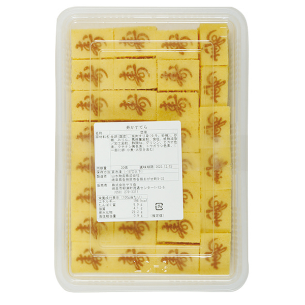 | 素材 | 全卵(国産)、魚肉すり身(タラ、砂糖)、砂糖、みりん、馬鈴薯澱粉、食塩、植物油脂/加工澱粉、酢酸Na、グリシン、カカオ色素、クチナシ黄色素、トウガラシ色素、(一部に卵・小麦・大豆を含む) |